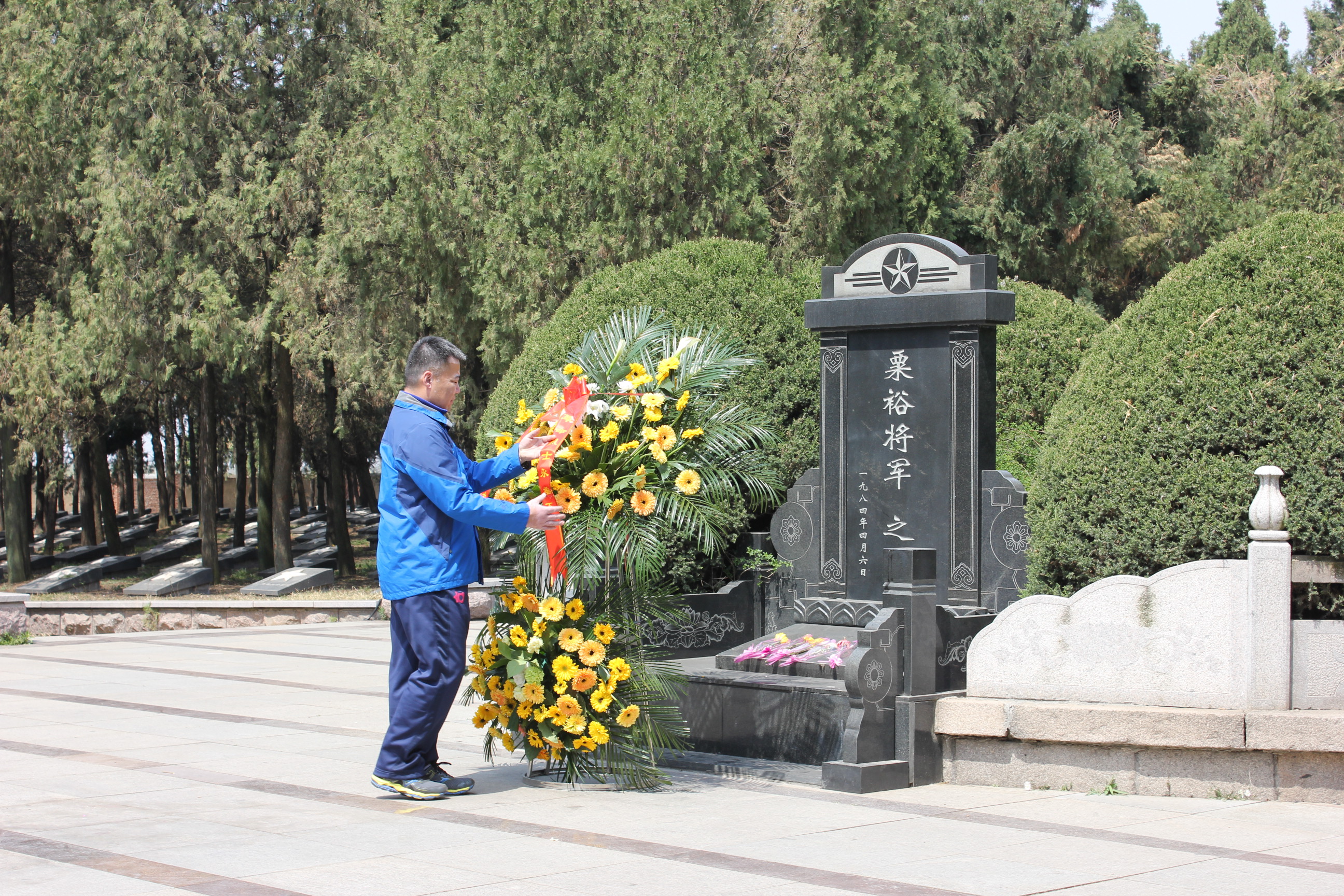 在烈士陵园区,墓地正中是粟裕将军骨灰撒放处,其后是烈士英名塔,塔身镌刻着在孟良崮战役中牺牲的2800多名烈士的姓名,墓区内掩埋着2800多名烈士的遗骨。全体党员向烈士塔敬献花圈,并在粟裕将军骨灰撒放处和烈士英名塔前举行了庄严的重温入党誓词仪式,全体党员举起右拳,面向鲜红的党旗和烈士墓碑庄严宣誓,“我志愿加入中国共产党……为共产主义奋斗终身”的铮铮誓言久久回荡,一种神圣的使命感在每个党员心中升腾。