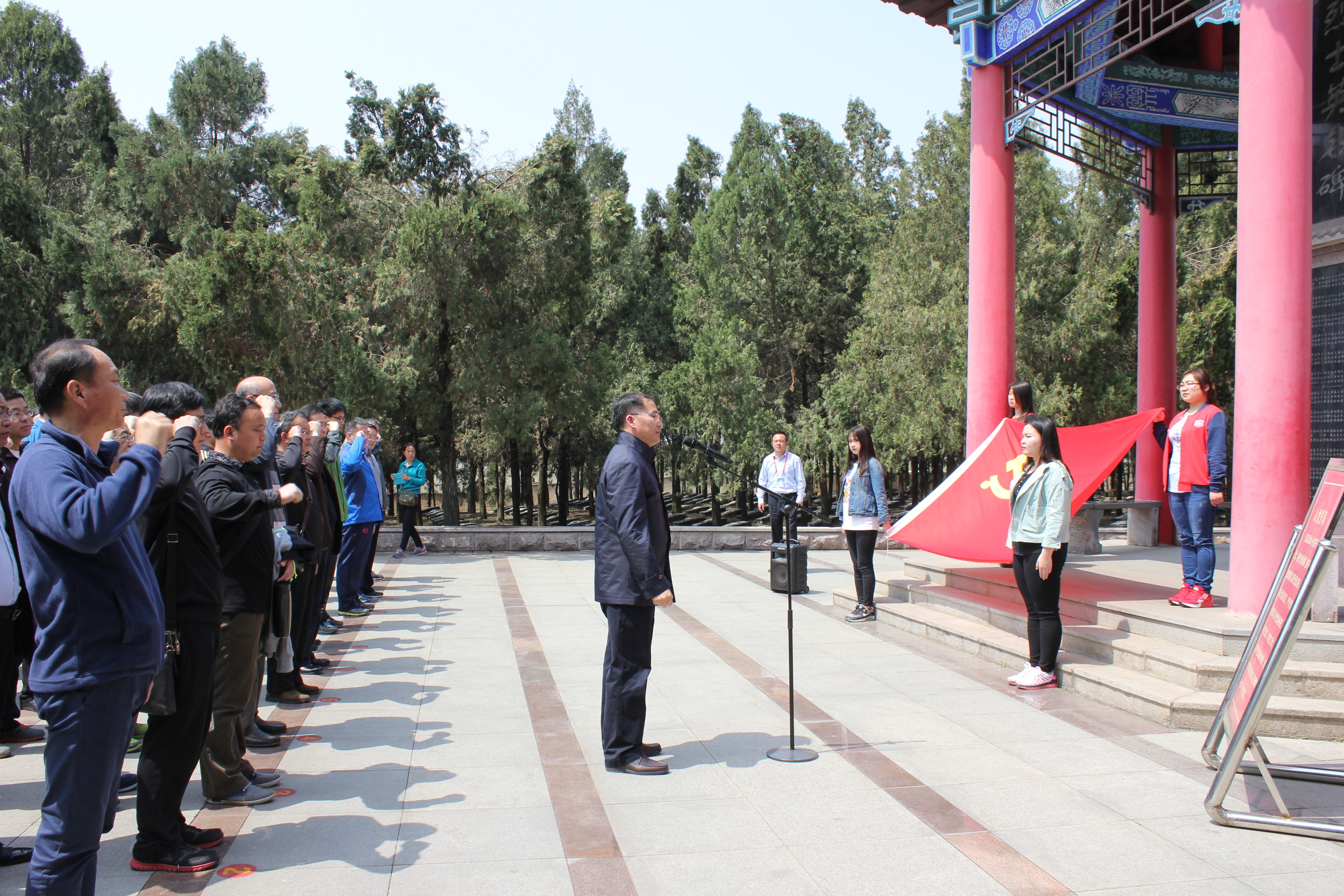 的全体党员和教职员工在各党总支带领下首先到达山东省爱国主义教育基地孟良崮战役纪念馆。孟良崮位于蒙阴县境内,举世闻名的孟良崮战役就发生在这里。1947年5月15日至16日我华东野战军在陈毅元帅、粟裕将军的指挥下,经浴血奋战,一举歼灭号称“五大主力之首”的国民党“王牌军”整编第74师,一举粉碎了蒋介石对山东重点进攻的战略图谋,在解放战争史上写下了光辉的一页。