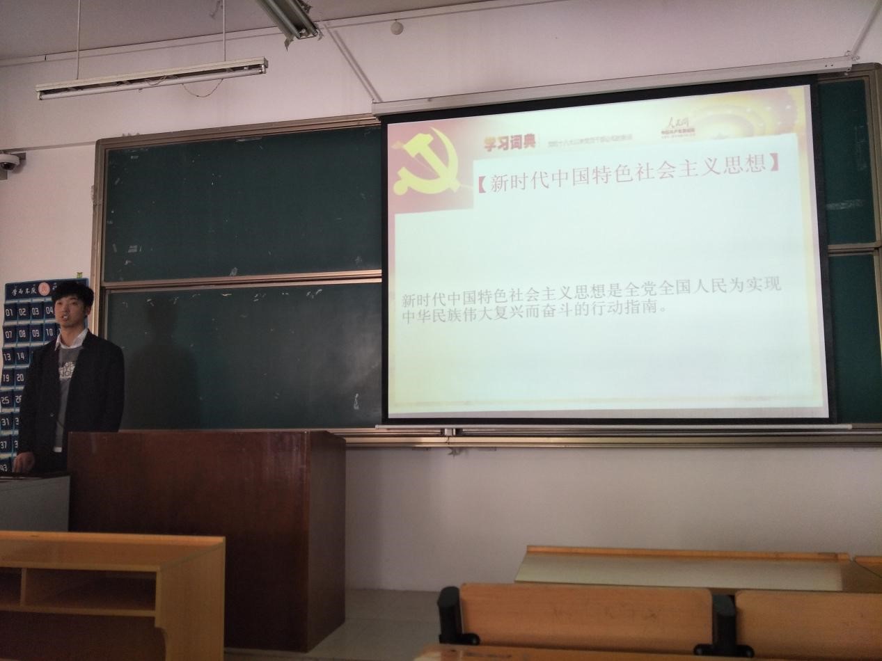 活动开始主讲人对党的十九大“不忘初心,牢记使命,高举中国特色社会主义伟大旗帜,决胜全面建成小康社会,夺取新时代中国特色社会主义伟大胜利,为实现中华民族伟大复兴的中国梦不懈奋斗。”的大会主题作出了详细阐释,帮助我们充分认识党的十九大的重大意义,增强我们学习贯彻党的十九大精神的自觉性和坚定性。随后,主讲人对党的十九大报告中关键词作出了充分而深入的阐述,包括党的十八大以来“极不平凡的五年”及党和国家在经济建设、深化改革、民主法制建设、思想文化建设、人民生活、生态文明建设等多个方面取得的十大“成就”等,如今中国特色社会主义进入新时代,我们应该把握时代定位,了解新时代社会主要矛盾,牢记新时期历史使命,明确三个“必须”即“实现伟大梦想,必须进行伟大斗争;实现伟大梦想,必须建设伟大工程;实现伟大梦想,必须推进伟大事业”及四个“伟大”即“伟大斗争,伟大工程,伟大事业,伟大梦想”的深刻含义。在活动中主讲人带领我们学习了新时代坚持和发展中国特色社会主义的基本方略并对“全面建设社会主义现代化国家新征程”、“两个一百年”、“建设现代化经济体系”、“全面开放新格局”、美丽中国“四大举措”、“反腐败国家立法”等诸多方面进行了深刻充实的介绍。