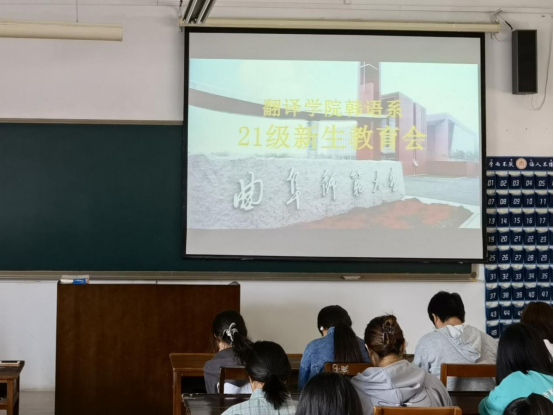 韩语系2021级新生教育会于D307教室召开。韩语系金东国副教授、系副主任仲维芳老师以及21级朝鲜语专业全体新生参加。会议由仲维芳老师主持,金东国副教授主讲。