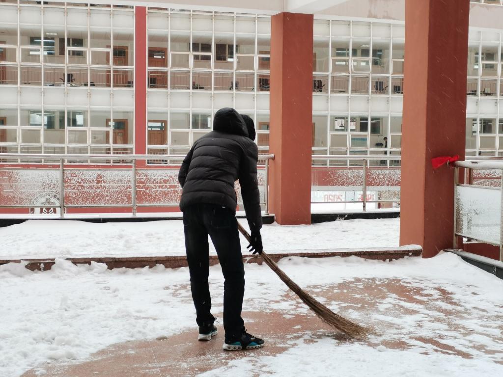一场瑞雪让学校银装素裹,校园路面出现积雪、结冰现象,给师生的出行带来一定的安全隐患。12月29日15:00,为保障师生的安全出行,斗地主