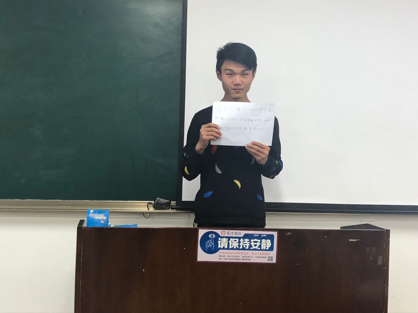 本次活动以“新时代新青年”为主题,共由“向祖国表白”和“红色诗篇朗诵”两个部分组成。首先,各班团支书宣读开场白,明确了活动的主题和意义。“向祖国表白”要求每人用马克笔在A4纸上写一句对祖国的祝愿表达自己对祖国的热爱。同学们全神贯注于祝福语的书写中,一丝不苟,点横撇捺,工整美观。作品完成后,同学们积极上台展示自己的祝福语,俊秀的字体间浓缩着他们对祖国深沉的爱意。“红色诗篇朗诵”要求各位同学宣读红色诗篇,同学们积极报名,踊跃参加。现场气氛热烈,朗诵者声情并茂,精彩纷呈,铿锵有力的声音与阵阵掌声回荡在整个教室。随后,各团支部带领各个小组进行红色经典作品讨论,并对具体问题发表了感悟。