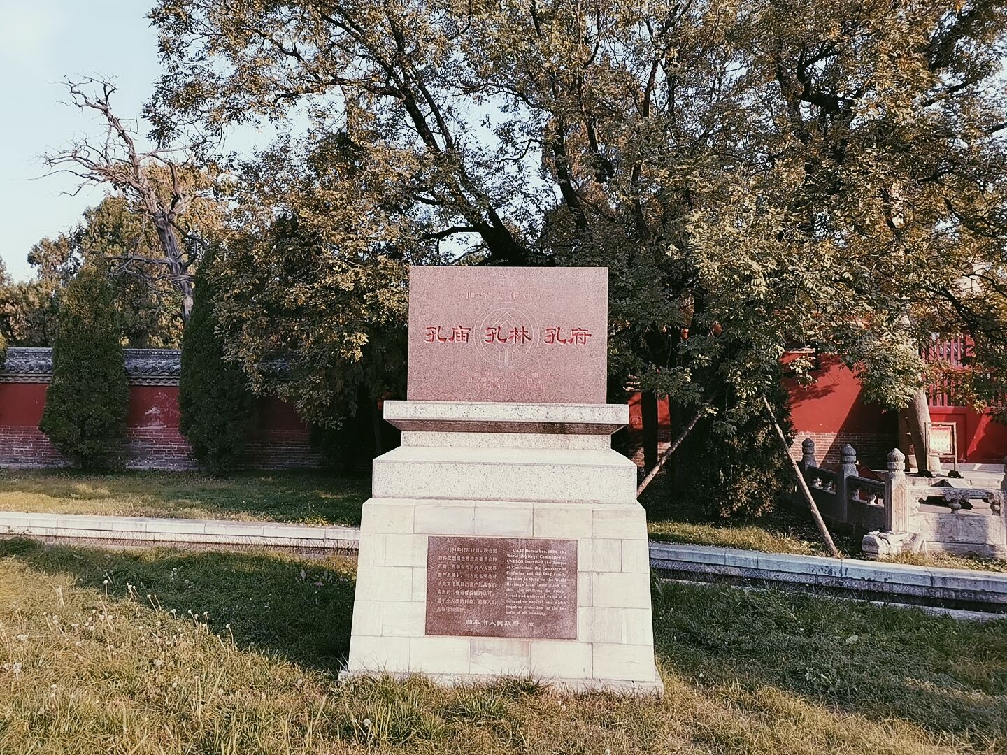 10月26日下午,2019级本科生分组参观了校史馆和教师博物馆。在讲解员的带领下,同学们领会了斯文在兹的真谛,深入理解了“学而不厌,诲人不倦”的校训要求。校史馆用一幅幅画作,一帧帧图片展现了学校的变革与发展。教师博物馆用一件件珍贵文物,一组组名师雕塑讲述中国教师故事,彰显尊师重教的优秀传统。在场学生深受感染,备感振奋。次日,全体师生参观了孔庙、孔府和孔林。曲阜孔庙是历史最久、规模最大、等级最高的孔庙。孔庙里金声玉振坊、大中门、大成殿等建筑气势恢宏、巨碑林立。通过对孔庙建筑的研究与探讨,同学们进一步感受到儒家文化的博大精深,加深了对儒家文化的理解。孔府毗邻孔庙,是孔子嫡系子孙居住之地。在这座"衍圣公府"中,陈列着大量书画艺术作品,分门别类地展示于不同的场馆中。孔林,是孔子及其家族的专用墓地,也是世界上延续时间最长的家族墓地。