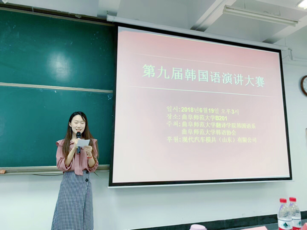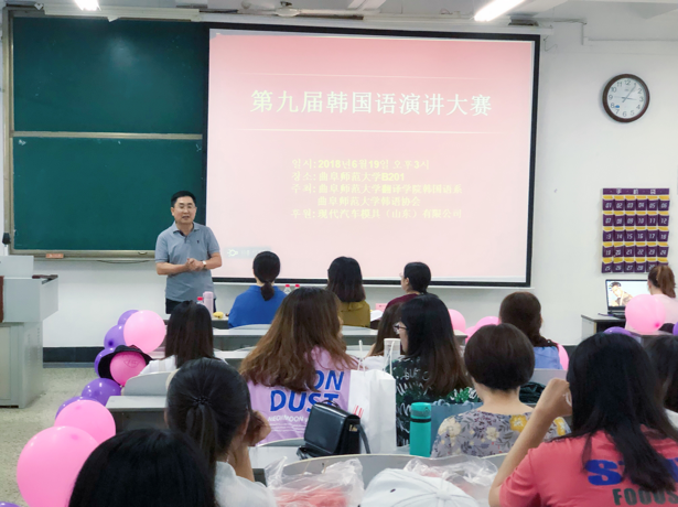 韩语协会主办,现代汽车模具(山东)有限公司赞助。韩国语系系主任金东国副教授、姜坤老师、章科佳老师出席了本次比赛。本次比赛由外国语职业大学韩国语系老师曲均丽老师、孙飞飞老师、马晓菲老师担任评委。韩语系2016级学生韩天琪担任本次比赛的主持人,韩国语系全体学生到场观看了比赛。