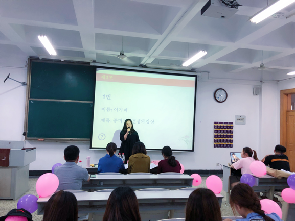 比赛伊始之前,金东国副教授对本次比赛发表致辞,表达对本次比赛的期待。比赛由定题演讲、即兴回答两部分组成。演讲主题涉及时事热点、韩国文化等,内容妙趣横生、丰富多彩。大三的同学们经过了三年的韩语学习,有着很强的语言实力,内容充实,发言流畅,竞争可谓非常激烈。在每一位同学韩语演讲结束后,评委老师进行即兴问答,同学不慌不忙地组织语言。参赛选手们稳定的发挥、机智的应答及出色的才艺展示给在场的所有观众留下了深刻印象,也为本次校园文化艺术节韩语相关活动锦上添花。