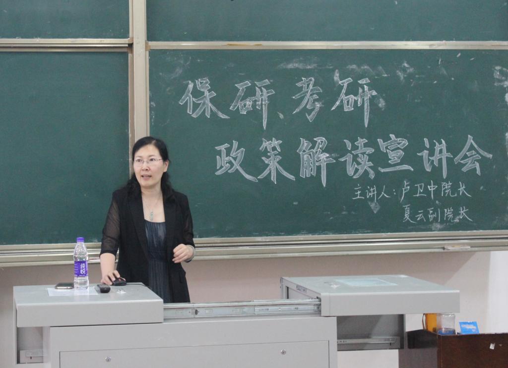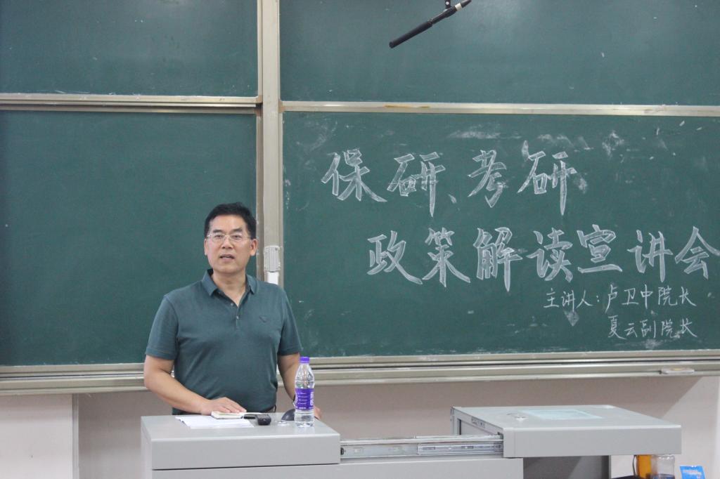 会议伊始,夏云副院长就我院保研考研政策进行了系统严谨、特色鲜明地解读。她通过详实的数据统计,全面分析了近年来我院本科生的保研、考研情况以及2016级本科生即将面临的严峻形势。接着,她重点围绕我院学科建设、师资配备、科研成果、奖助政策、学术交流等方面展开详细解读,强调考研备考、复试准备的重要性。此外,她推介了我院特色与优势学科建设以及我院在国家社科基金项目、教育部人文社科研究规划项目等方面的一系列学术研究成果。随后,卢卫中院长强调了我院在师资力量、学术科研、研究生培养,特别是研究生实践实训培养方面的优势。他结合自身求学经历,以幽默的言语、诙谐的形式为在场学生阐释了“唯有刻苦学习、奋力拼搏,方能在科研学术道路上崭露头角”的道理,并明确指出专业学科竞赛和海外留学经历的重要性,期望我院学生能不断丰富知识体系,提升综合实力,在2020年的研究生入学考试中取得可喜成绩。伴随着热烈的掌声,宣讲会圆满结束。