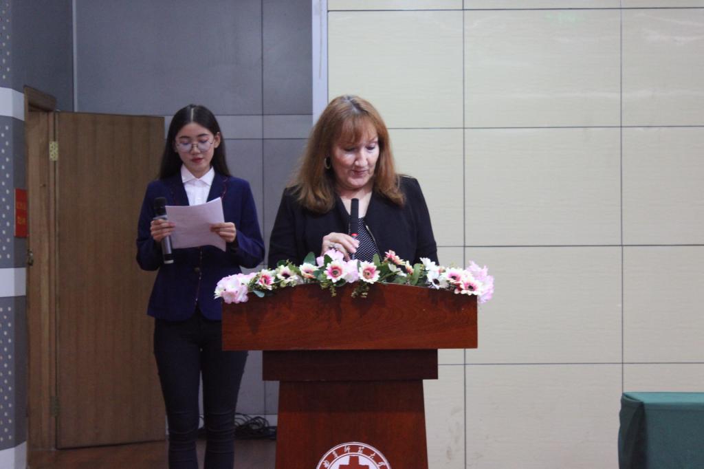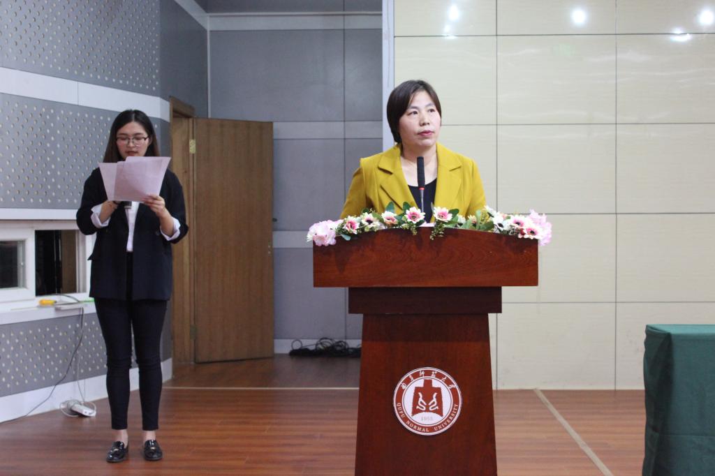 的师资力量、本科和研究生教育现状及未来的发展规划,并对新生提出了具体的要求与建议。接着,教师代表外教帕麦拉女士发表讲话,对新生的到来表示热烈欢迎,徐凤老师则以幽默诙谐的语言、通过生动的小故事向同学们展现了大学生活的丰富多彩并表达了对同学们过好大学生活、充实大学生活的期许。接着,老生代表乔宇同学、新生代表杨玉洁同学依次发言。各师生代表发言期间有来自各专业的优秀学子做现场交替传译,充分展现了斗地主