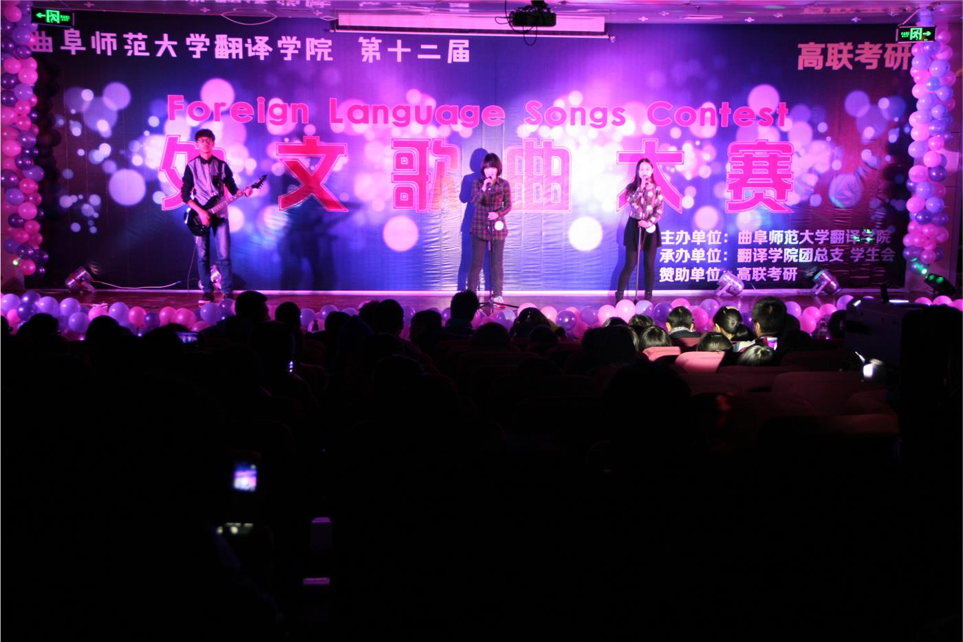 团总支学生会承办的第十二届外文歌曲大赛决赛在图书馆报告厅隆重举行。出席并担任本次大赛的评委老师有有外教Mr.Randoll、Mr.Patrick、金敬姬女士、丹后吉藏先生,音乐斗地主