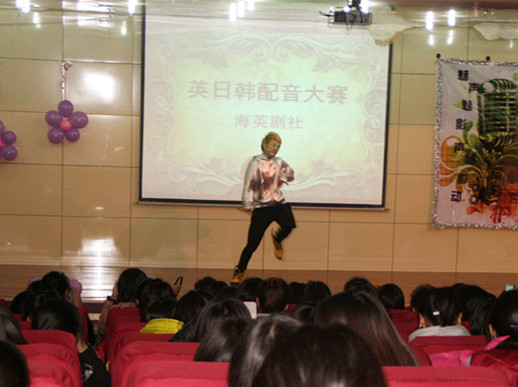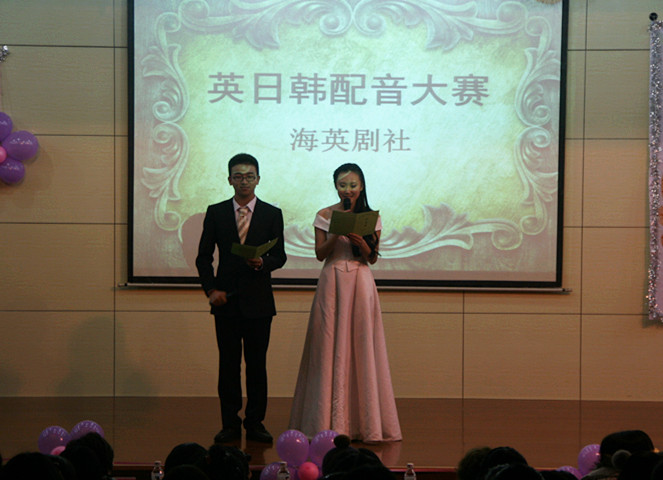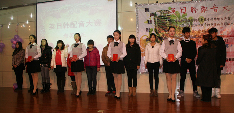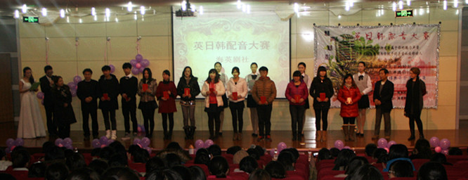 比赛伊始,陈正同学精彩的开场舞瞬间点燃了现场的气氛,伴随着热烈的掌声,由徐菲等人组成的第一组参赛选手带着自己的作品——《疯狂原始人》登台表演。随后,日语剧《未闻花名》、韩语剧《主君的太阳》等节目也陆续登场,选手们通过真挚的情感、默契的配合,伴随着诙谐幽默的画面,让在场观众和评委领略到了各个团队的风采。最后,由李昌铼、马立锐、张雷等同学为大家带来的中文搞笑配音《进击吧!选课!》为此次比赛画上了圆满的句号。最终评委们综合各组选手的语言水平、剧情表现力、综合效果和时间把握情况等评出了次比赛的最终结果:英语剧《卑鄙的我2》、日语剧《爱莎宝贝》、韩语剧《美女的烦恼》获得一等奖;英语剧《疯狂原始人》、《怪兽大学》,日语剧《未闻花名》、韩语剧《主君的太阳》获得二等奖;英语剧Mean girls、Gossip girl和韩语剧《仍想结婚的女人》获得三等奖。