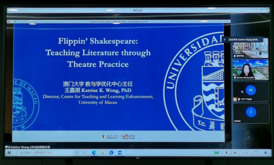 第一场报告题目为“Flippin’ Shakespeare: Teaching Literature through Theatre Practice”。首先,王嘉褀教授围绕课程设置、课堂活动为与会师生介绍如何在表演中学习和领悟莎士比亚经典戏剧。随后,王教授以《麦克白》片段为例,跟与会师生共同讨论如何通过格律、韵律等文学知识进行人物形象的塑造。最后,王教授结合教学经验,提出几点教学思考,一要将静态拥有知识变为活动形式呈现,二要重视小组合作,三要丰富评价方式。