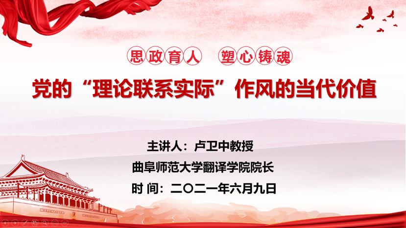 最后,卢院长结合“理论联系实际与个人工作、学习的关系”指出,当今世界面临百年未有之大变局,中国正处于两个一百年战略交汇点上,当代青年应树立远大的理想、担当时代之重任、勇于砥砺奋斗。我校作为一所有韧性、有睿性、有德性的大学,以学而不厌、诲人不倦的品格滋养一代又一代曲园人的心灵和精神。我院自建院以来,不断创新办学理念与人才培养模式,培养出一批又一批高素质、复合应用型、创新型、国际化专业外语人才和语言服务人才,因此,各位同学应在世界、国家、学校和斗地主