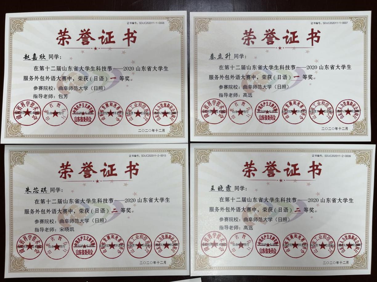 日语专业和朝鲜语专业十一名学生参赛并取得优异成绩,其中,日语专业秦立升、赵嘉欣荣获一等奖,日语专业朱芯琪、赵晓霏获得二等奖,日语专业高雨葭、李鑫玥、李洁、张瑞雪、张艳秋、张力月和朝鲜语专业韩雅迪获得三等奖。此外,包芳、徐凤、宋晓凯、高远四位教师荣获“优秀指导教师”奖项,斗地主