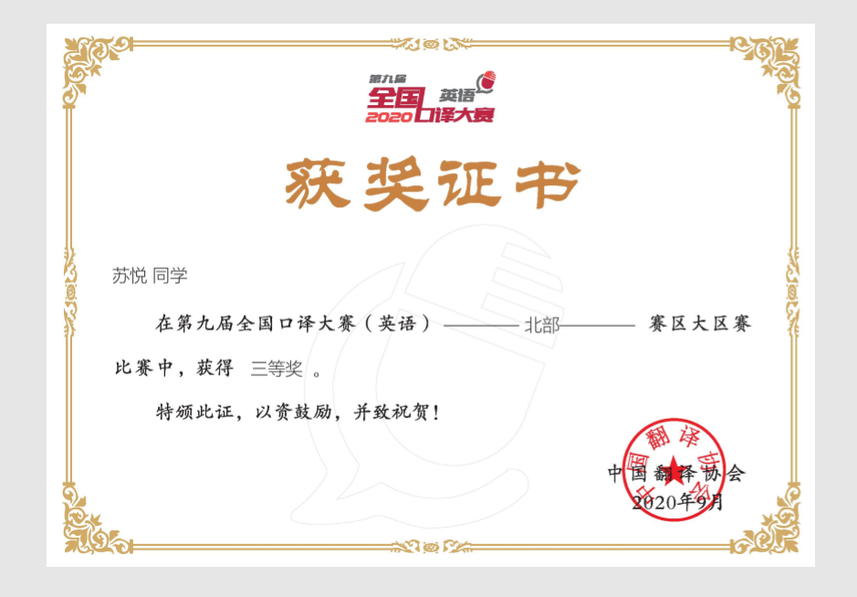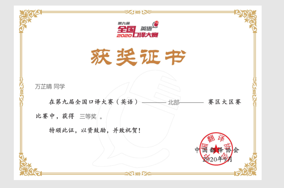 2019级硕士研究生万芷晴、2017级翻译本科生苏悦分别荣获三等奖,2018级翻译本科生姜睿芯荣获优秀奖及“译员风采奖”。