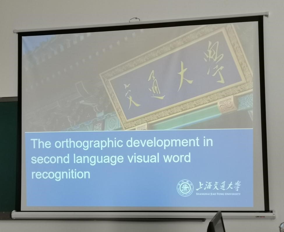 报告分为两部分,第一部分是具体研究分享,主题为“英语词汇阅读中的正字法表征的发展及其影响因素:来自掩蔽启动实验的证据”。报告中,吴教授首先为大家讲解了正字法表征的重要性及发展,随后对研究中所用的掩蔽启动实验的实验步骤、实验设计、实验结果以及实验数据分析做了系统的介绍。报告期间,我院师生针对实验设计积极提问,大家一起探讨学术问题,现场气氛持续高涨。