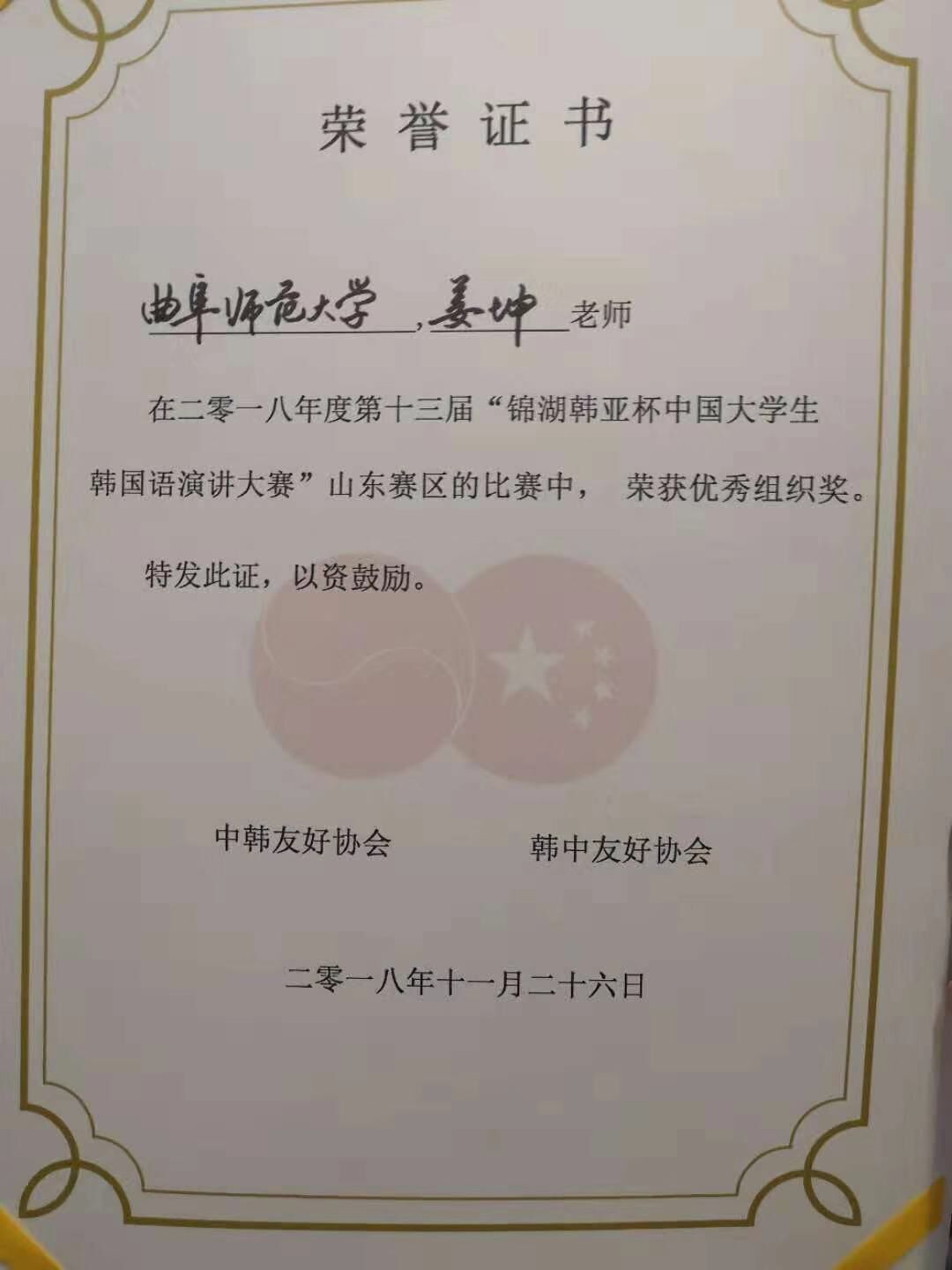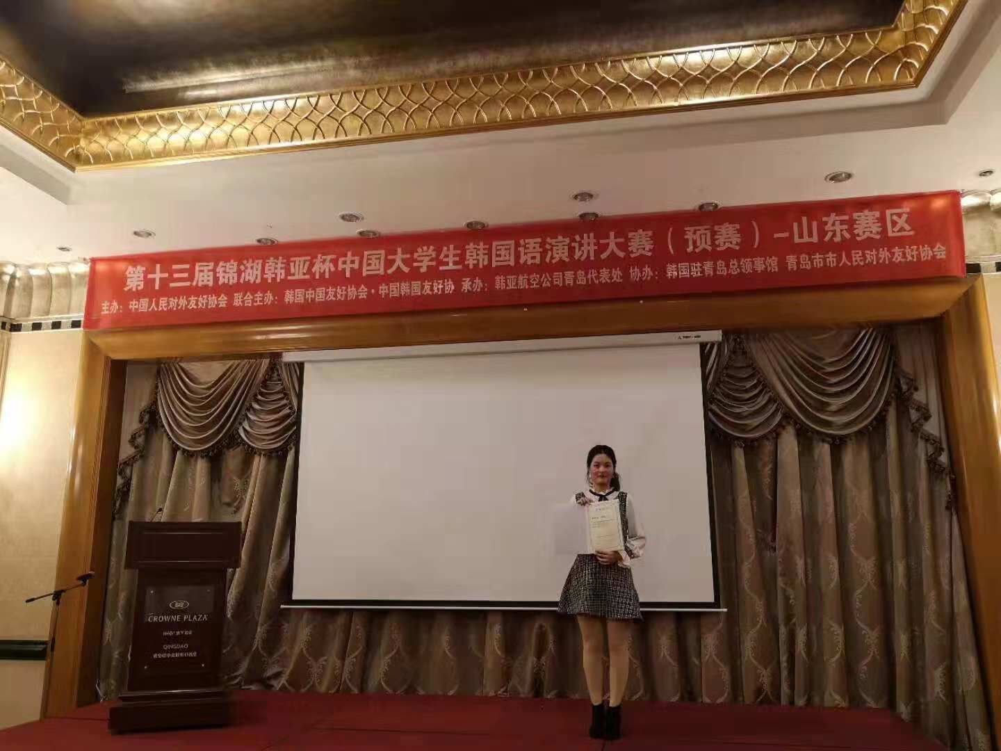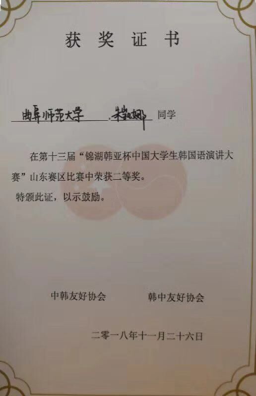 2018年11月26日,为促进中韩友好往来,加强各高校学生对韩国文化的理解,韩亚杯比赛于山东青岛举行。我校由姜坤老师指导的2016级朱凯娜同学参加了本次比赛并获得了二等奖的好成绩。