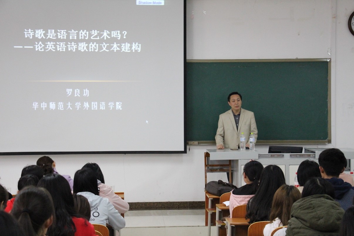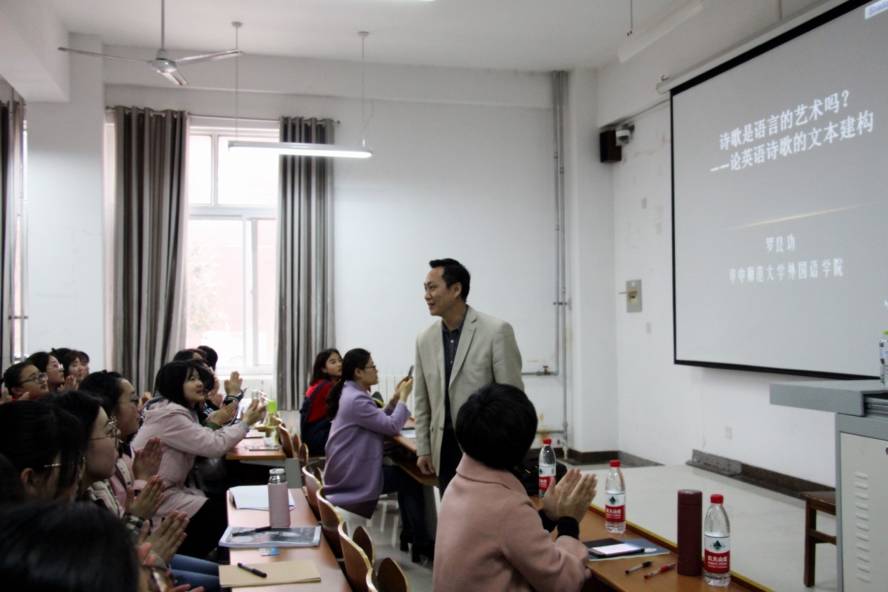 师生做了题为“诗歌是语言的艺术吗?——论英语诗歌的文本建构”的学术报告。本次报告由夏云副院长主持,我院多名教师以及部分研究生和本科生聆听了报告。
