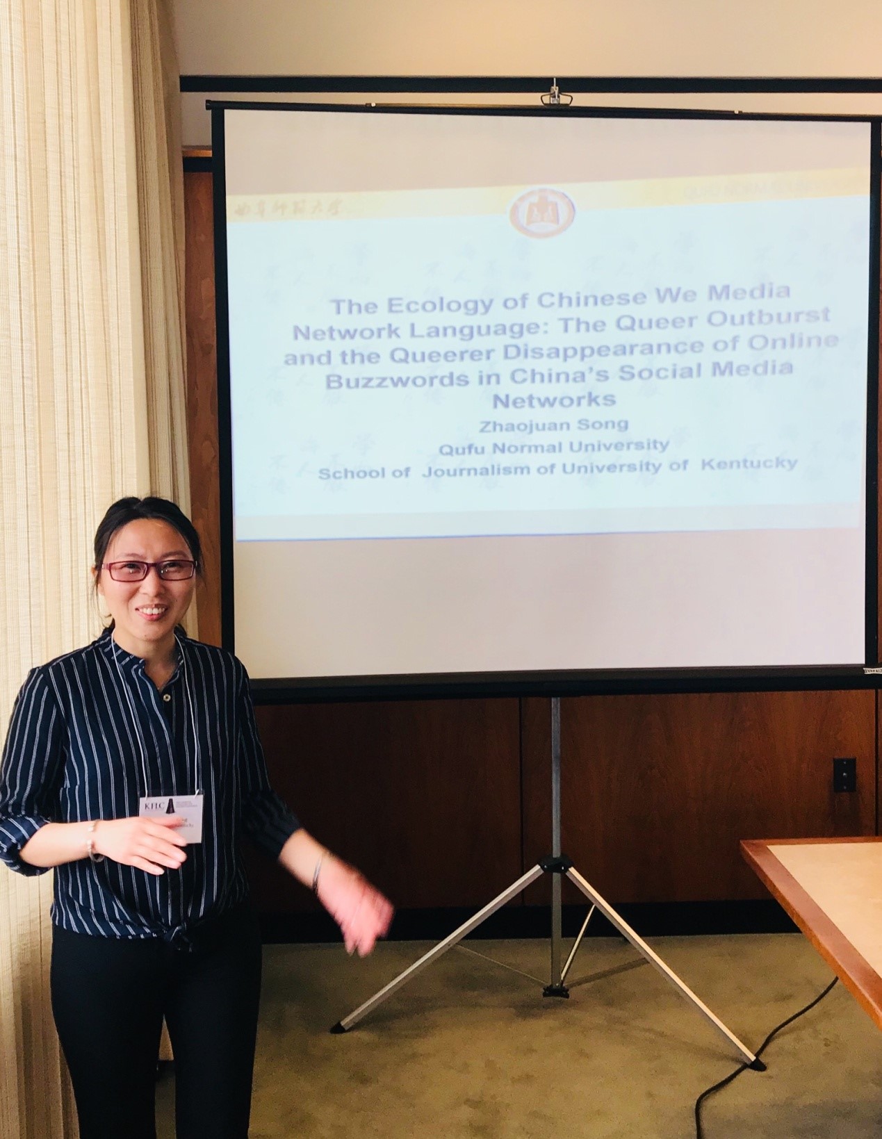 4月19-21日,我院在美国肯塔基大学交流访学的宋兆娟老师参加了KFLC ——肯塔基语言、文学、文化国际学术会议,其论文The Ecology of Chinese We Media Network Language: The Queer Outburst and the Queerer Disappearance of Online Buzzwords in China’s Social Media Networks被大会录用,并在会议上宣讲了论文。
