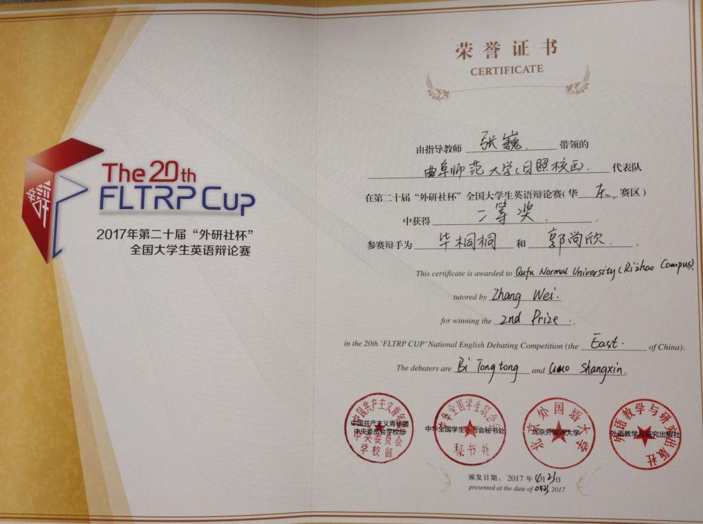 自去年11月开始,华东赛区经过5个月的校园选拔赛,来自安徽、上海、江苏、浙江、山东的93支参赛队伍进入地区决赛。比赛采用英国议会辩论赛制,辩题涉及政治、经济、伦理、教育、文化等社会热点问题。在为期三天紧锣密鼓的模拟赛及五轮循环赛中,我院参赛学子毕桐桐、郭尚欣在张巍副教授指导下获得第27名。两名同学充分展现出我校大学生睿智和善辩的风采,最终获得华东赛区二等奖的好成绩。