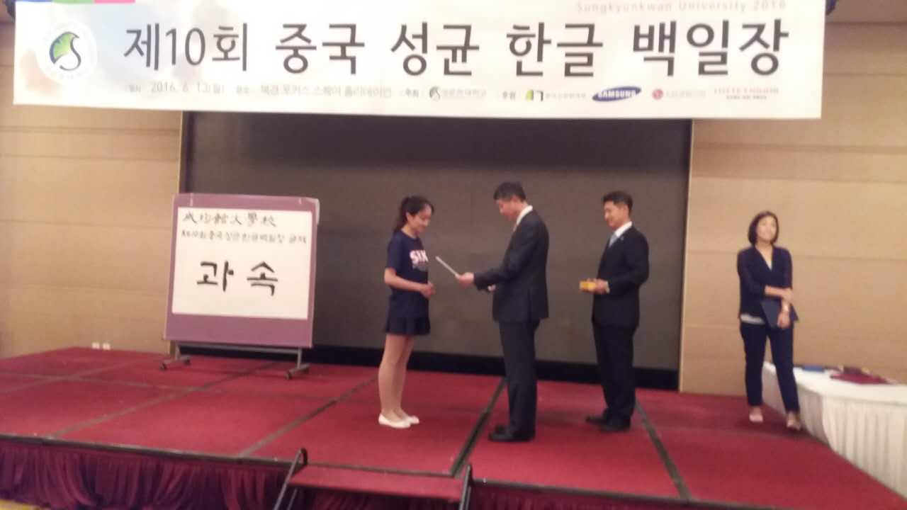 2016年6月13日,第10届韩国成均馆杯全国大学生韩语写作大赛在北京方恒国际酒店举行。本次大赛由韩国成均馆大学主办,共有来自北京大学、北京外国语大学、复旦大学、天津外国语大学等全国52所高校共90余名拔尖学生参加了比赛,是目前我国国内规模最大、级别最高的韩国语写作比赛。本次大赛共设金、银、铜奖各1名、佳作奖10名、优秀奖10名。我校斗地主