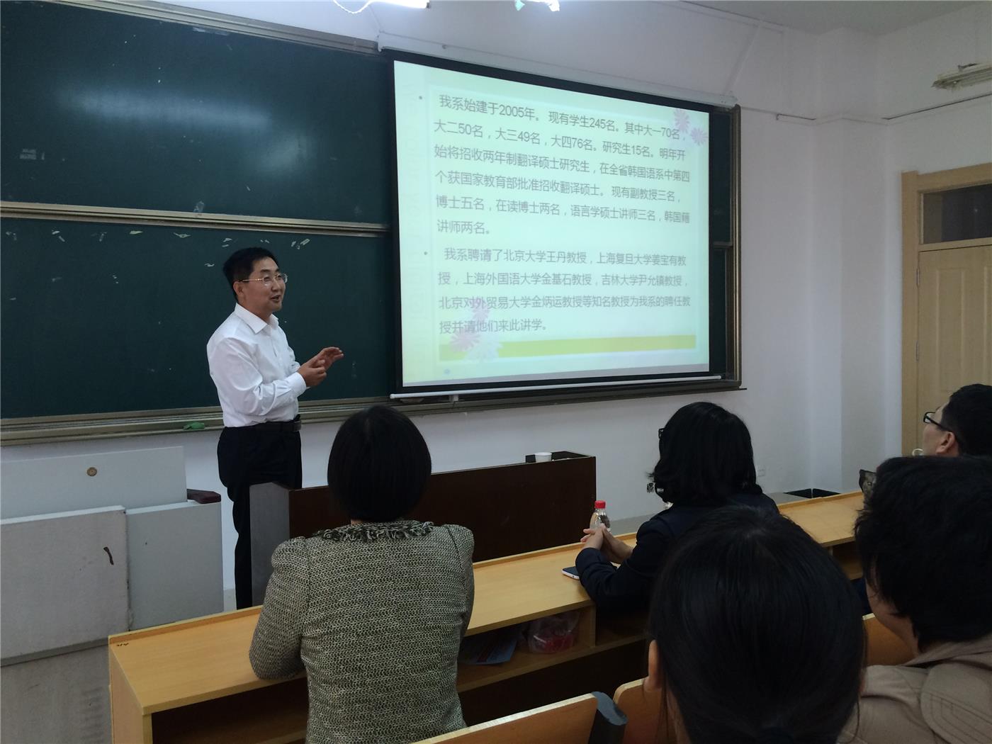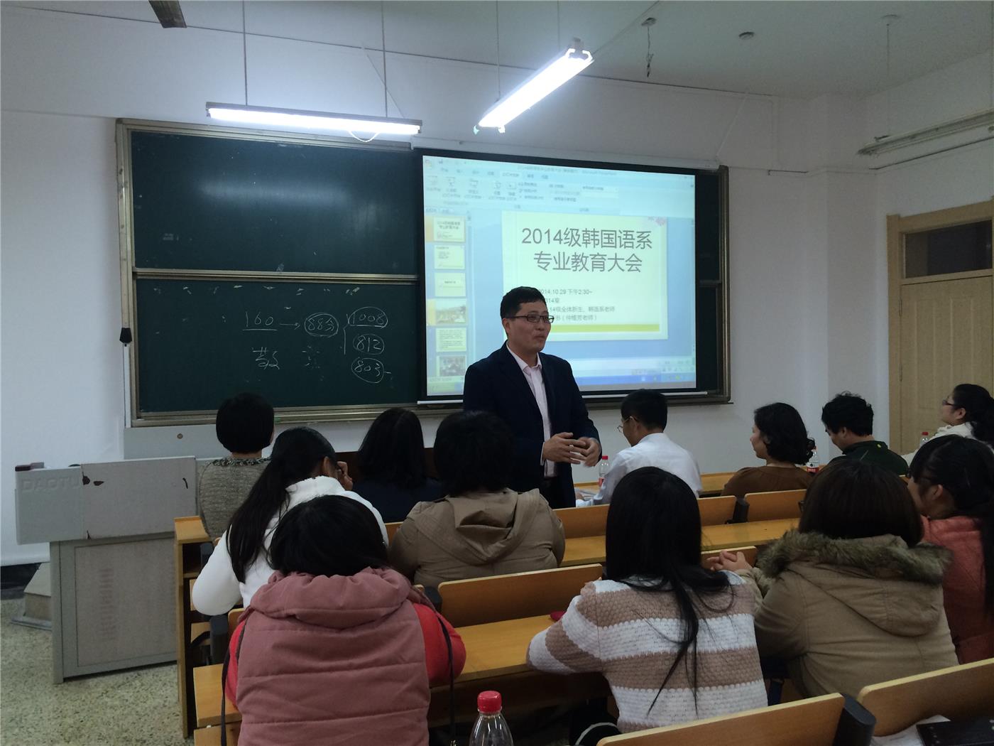 朝鲜语系主任金东国,副教授卢正爱,朝鲜语系其他几位老师以及朝鲜语系2014级全体新生参加了本次会议,本次会议由仲维芳老师主持。