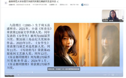 外国文学研究所第五期研究生读书分享会在JC801会议室及腾讯会议平台同步举行。本期读书会分享人为外国文学研究所所长侯冬梅副教授,分享的图书是日本作家九段理江荣获2024年度第170届芥川奖的获奖作品《东京都同情塔》。日语系师生以及兄弟院系的本科生同学参加了此次读书分享。