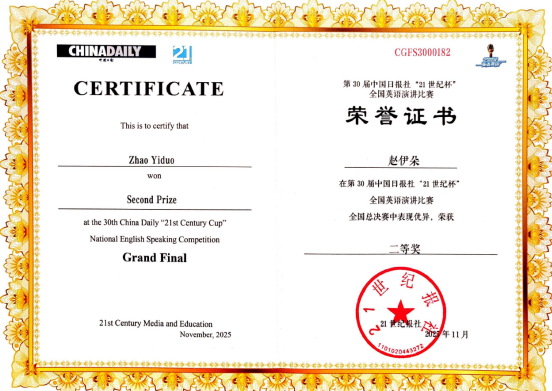 11月13日—17日,第30届“21世纪杯”全国大学生英语演讲比赛总决赛在浙江杭州举行,我院2022级商务英语专业学生赵伊朵(指导教师:张巍),凭借扎实的语言功底与出色临场表现,荣获全国总决赛二等奖。